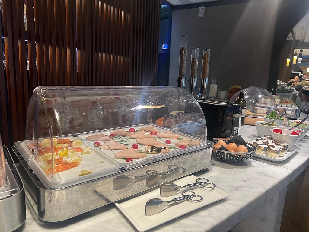 The spread included an assortment of breads and cold cuts, yogurts, fresh fruit, and eggs prepared in a variety of ways.