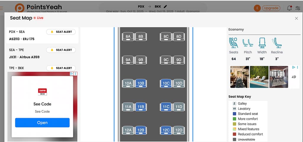 Pointsyeah’s award search tools are impressive in their ease of use and level of detail in information available for flights as far out as a year. For die-hard points veterans, having the access to live seat maps is a game-changing luxury as award bookings in years past have required cross-references of aircraft layouts and award booking sites, not to mention the fear that the seats may be phantom award space.